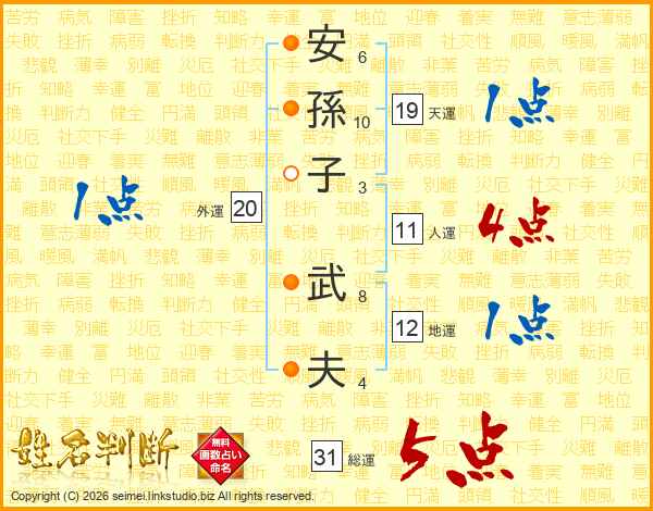 安(6画)孫(10画)子(3画) 武(8画)夫(4画)
