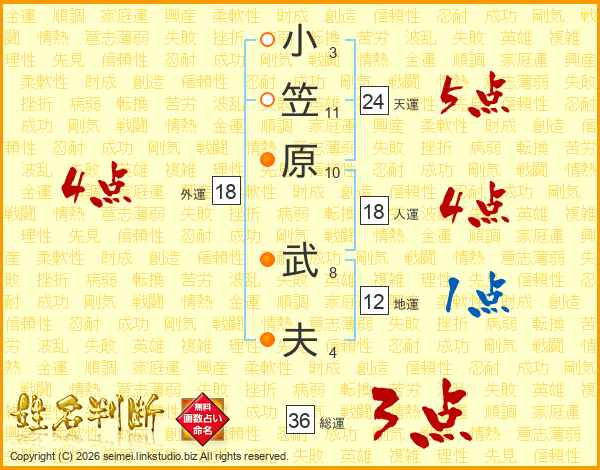 小(3画)笠(11画)原(10画) 武(8画)夫(4画)