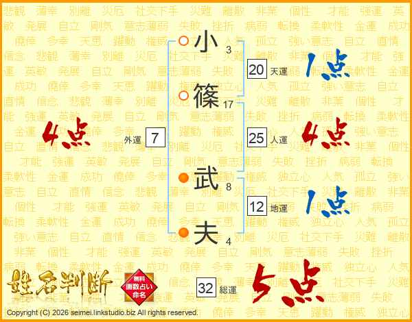 生活面を象徴する運勢です。外部から受ける影響力を表し、結婚運、家庭運や職場、環境への順応性を表します。総運から人運を引いた画数。姓や名が1文字の場合を除く。