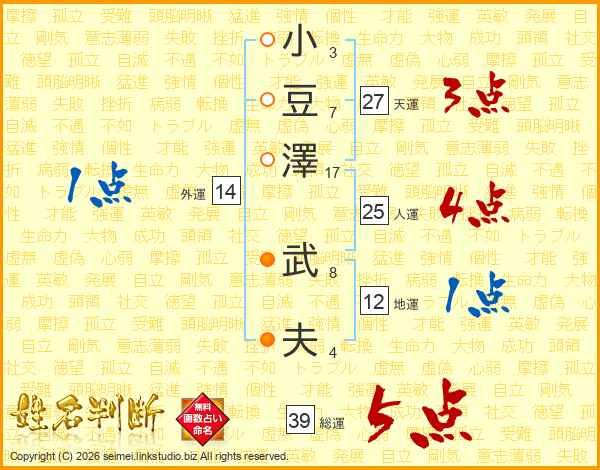 小豆澤武夫さんの総運は39画の5点!
