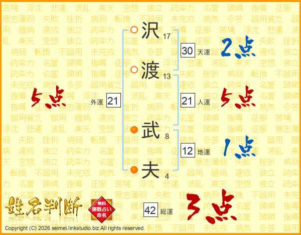 沢(17画)渡(13画) 武(8画)夫(4画)