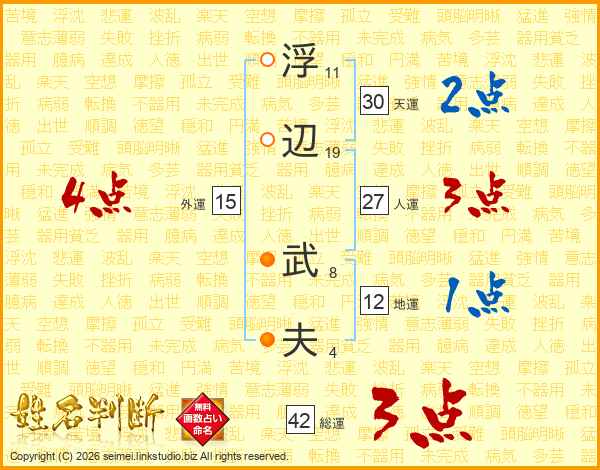 浮(11画)辺(19画) 武(8画)夫(4画)