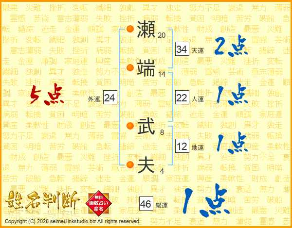瀬(20画)端(14画) 武(8画)夫(4画)