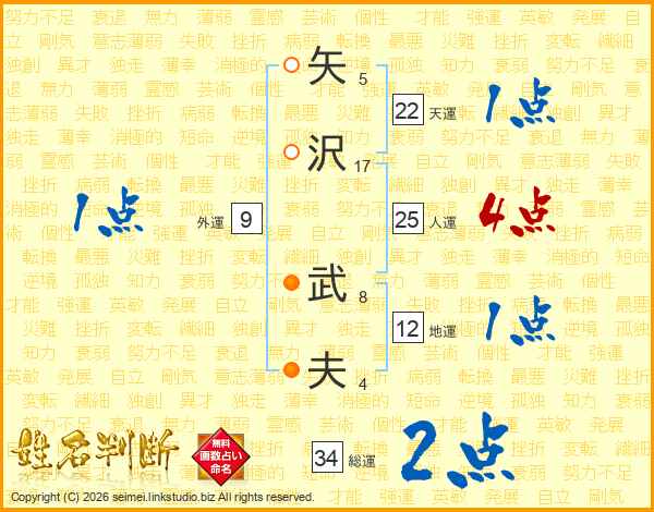 矢(5画)沢(17画) 武(8画)夫(4画)