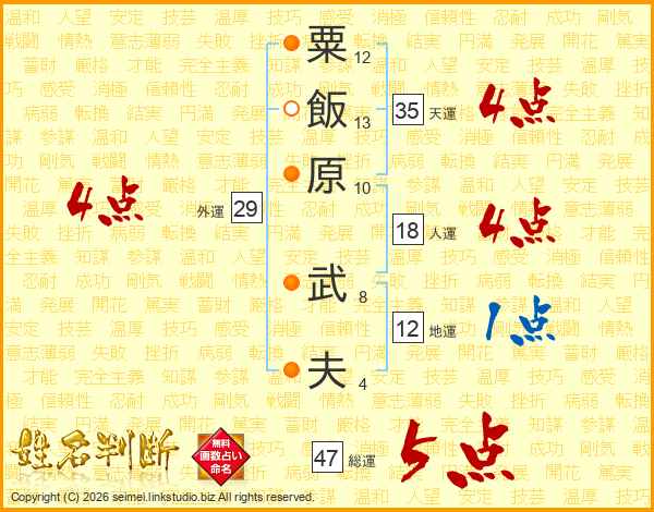 粟(12画)飯(13画)原(10画) 武(8画)夫(4画)