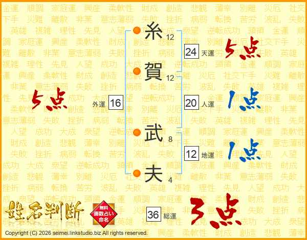 糸(12画)賀(12画) 武(8画)夫(4画)