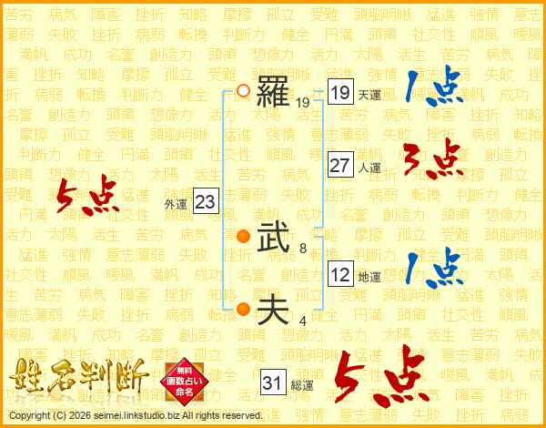 あなたの人生を表す1番重要な運勢です。生涯を通じて影響する総合運となり、主に50歳以降の晩年期に影響を及ぼします。苗字と名前の合計画数。
