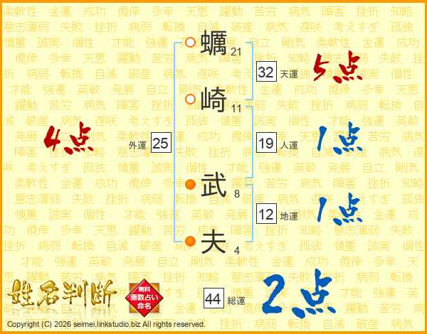 蠣(21画)崎(11画) 武(8画)夫(4画)