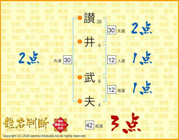 あなたの人生を表す1番重要な運勢です。生涯を通じて影響する総合運となり、主に50歳以降の晩年期に影響を及ぼします。苗字と名前の合計画数。