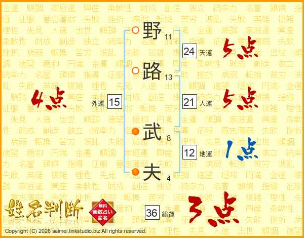 野(11画)路(13画) 武(8画)夫(4画)