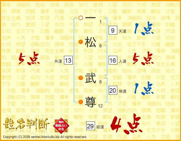 あなたの人生を表す1番重要な運勢です。生涯を通じて影響する総合運となり、主に50歳以降の晩年期に影響を及ぼします。苗字と名前の合計画数。
