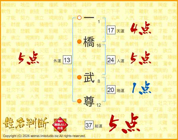 一橋武尊さんの総運は37画の5点!