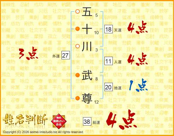 五十川武尊さんの総運は38画の4点!