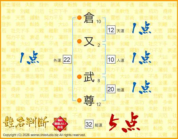 生活面を象徴する運勢です。外部から受ける影響力を表し、結婚運、家庭運や職場、環境への順応性を表します。総運から人運を引いた画数。姓や名が1文字の場合を除く。