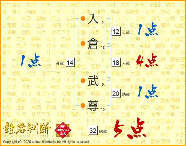 生活面を象徴する運勢です。外部から受ける影響力を表し、結婚運、家庭運や職場、環境への順応性を表します。総運から人運を引いた画数。姓や名が1文字の場合を除く。