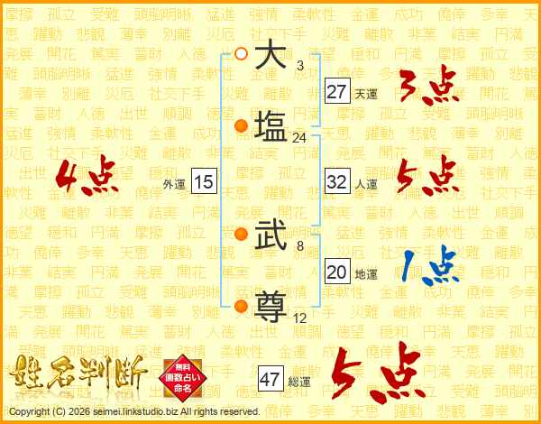 生活面を象徴する運勢です。外部から受ける影響力を表し、結婚運、家庭運や職場、環境への順応性を表します。総運から人運を引いた画数。姓や名が1文字の場合を除く。