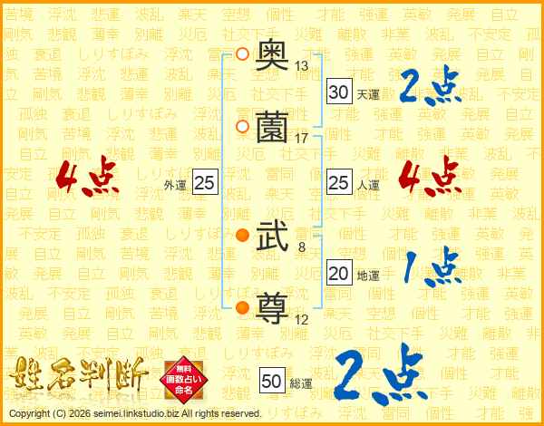 奥(13画)薗(17画) 武(8画)尊(12画)