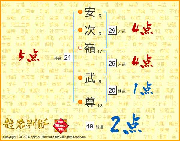 安(6画)次(6画)嶺(17画) 武(8画)尊(12画)