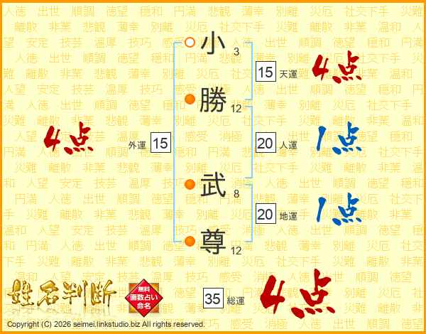 生活面を象徴する運勢です。外部から受ける影響力を表し、結婚運、家庭運や職場、環境への順応性を表します。総運から人運を引いた画数。姓や名が1文字の場合を除く。