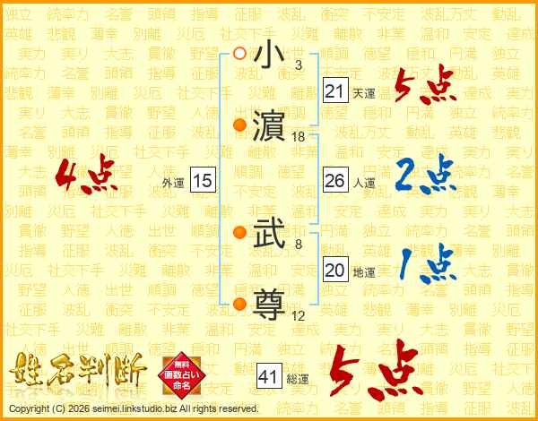 あなたの人生を表す1番重要な運勢です。生涯を通じて影響する総合運となり、主に50歳以降の晩年期に影響を及ぼします。苗字と名前の合計画数。