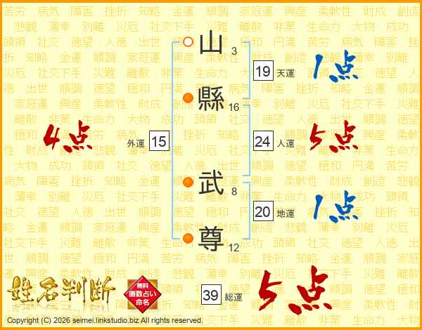 山縣武尊さんの総運は39画の5点!