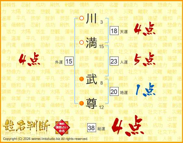 川(3画)満(15画) 武(8画)尊(12画)