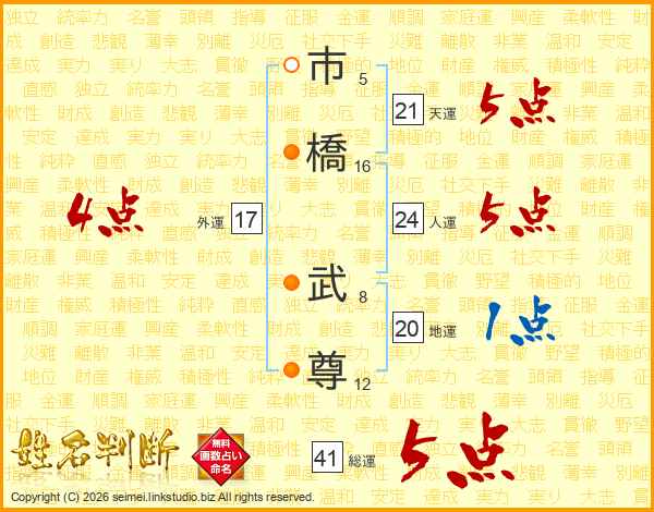 あなたの人生を表す1番重要な運勢です。生涯を通じて影響する総合運となり、主に50歳以降の晩年期に影響を及ぼします。苗字と名前の合計画数。