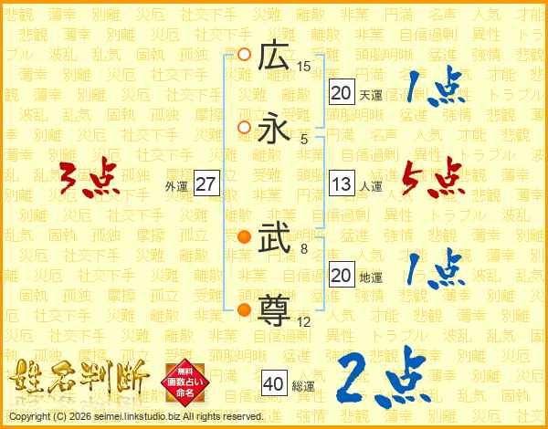 広(15画)永(5画) 武(8画)尊(12画)