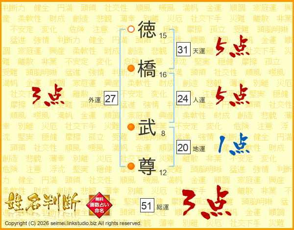 徳(15画)橋(16画) 武(8画)尊(12画)