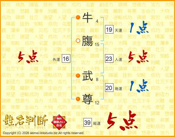牛膓武尊さんの総運は39画の5点!