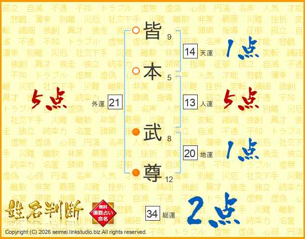 生活面を象徴する運勢です。外部から受ける影響力を表し、結婚運、家庭運や職場、環境への順応性を表します。総運から人運を引いた画数。姓や名が1文字の場合を除く。