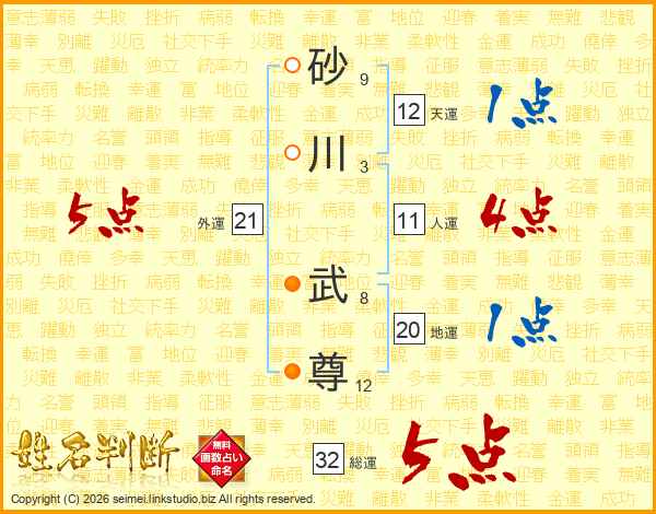 砂川武尊さんの総運は32画の5点!