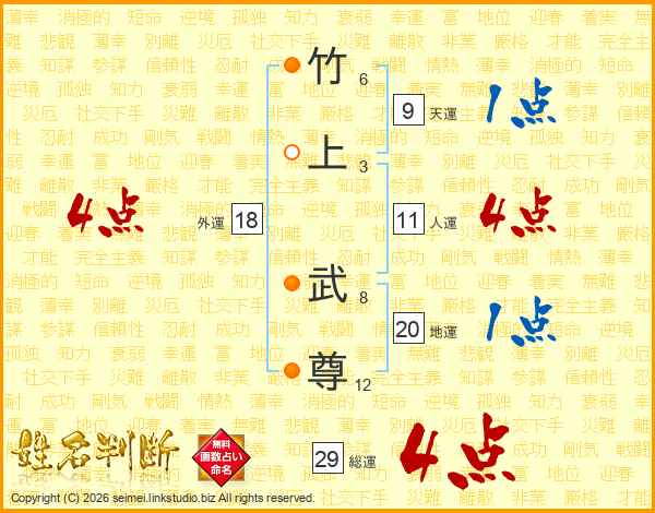 生活面を象徴する運勢です。外部から受ける影響力を表し、結婚運、家庭運や職場、環境への順応性を表します。総運から人運を引いた画数。姓や名が1文字の場合を除く。