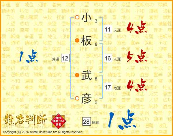 生活面を象徴する運勢です。外部から受ける影響力を表し、結婚運、家庭運や職場、環境への順応性を表します。総運から人運を引いた画数。姓や名が1文字の場合を除く。