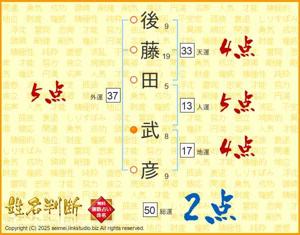 後(9画)藤(19画)田(5画) 武(8画)彦(9画)