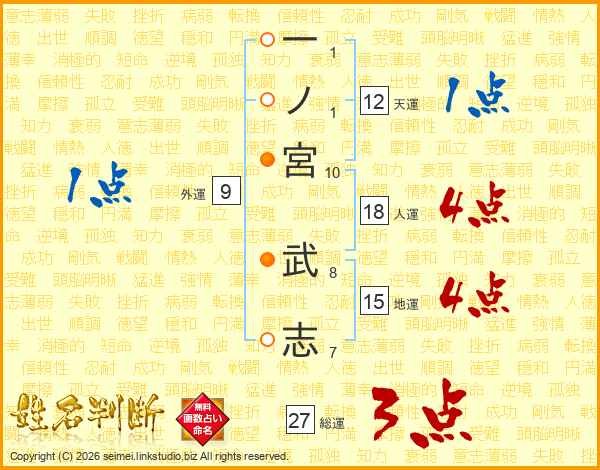 一(1画)ノ(1画)宮(10画) 武(8画)志(7画)