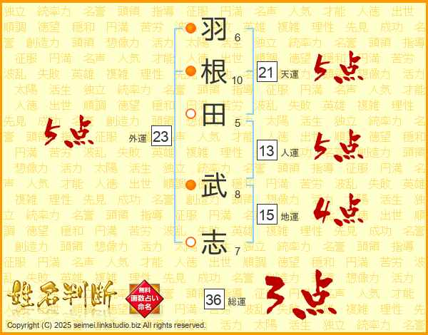 羽(6画)根(10画)田(5画) 武(8画)志(7画)