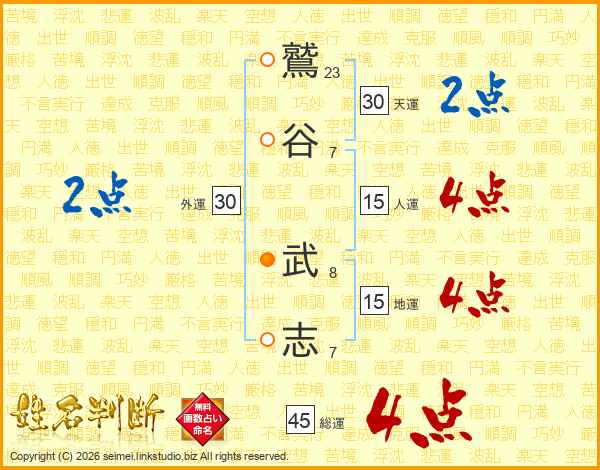 鷲(23画)谷(7画) 武(8画)志(7画)
