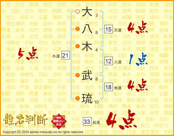 大(3画)八(8画)木(4画) 武(8画)琉(10画)