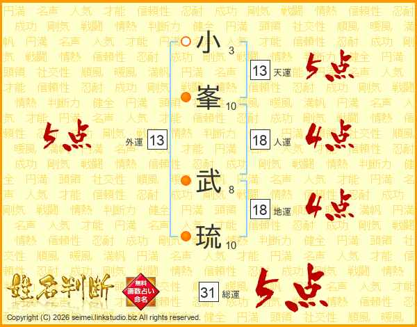 小(3画)峯(10画) 武(8画)琉(10画)