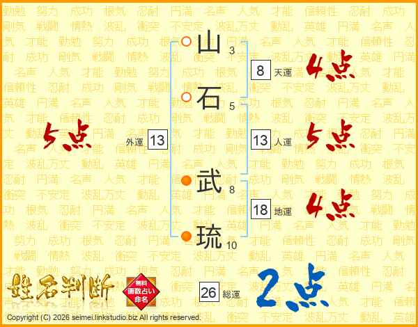 山(3画)石(5画) 武(8画)琉(10画)