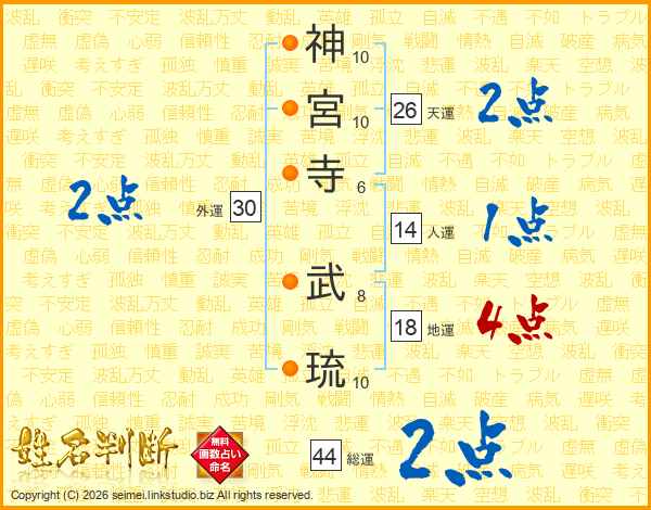 神(10画)宮(10画)寺(6画) 武(8画)琉(10画)