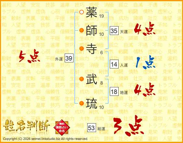 薬師寺武琉さんの外運は39画の5点!