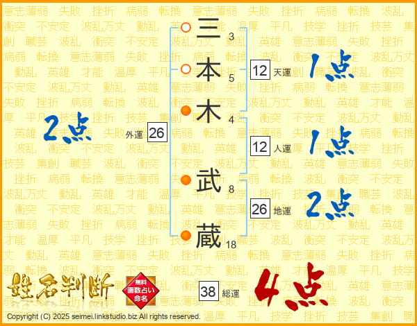 三(3画)本(5画)木(4画) 武(8画)蔵(18画)