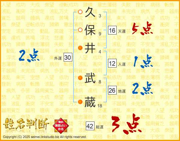久(3画)保(9画)井(4画) 武(8画)蔵(18画)