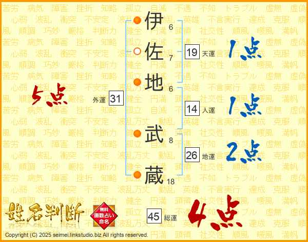 伊佐地武蔵さんの総運は45画の4点!