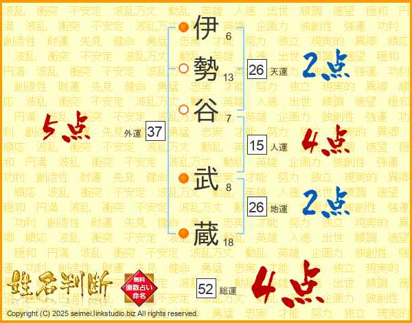伊勢谷武蔵さんの総運は52画の4点!