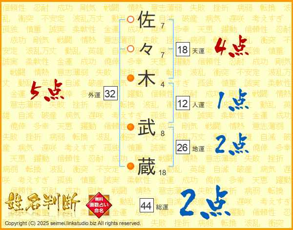 佐(7画)々(7画)木(4画) 武(8画)蔵(18画)