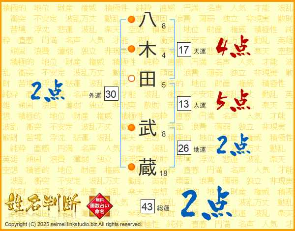 八(8画)木(4画)田(5画) 武(8画)蔵(18画)