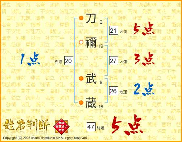 刀(2画)禰(19画) 武(8画)蔵(18画)